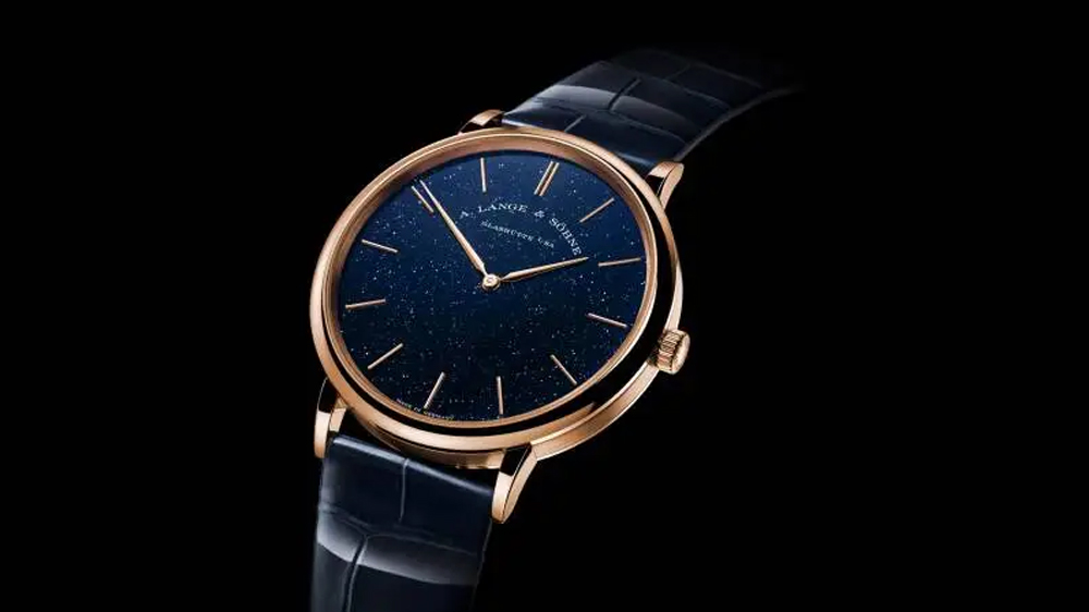 朗格SAXONIA萨克森纤薄腕表,18K玫瑰金表壳搭配铜蓝色表盘,尽显优雅风范 朗格推出以18K玫瑰金制成的SAXONIA萨克森纤薄腕表,限量发行50枚。实心银表盘饰以蓝色砂金石玻璃,内含微小的铜色颗粒,宛如星..