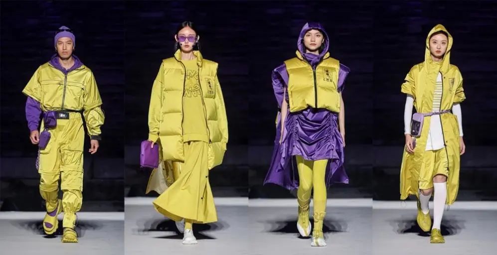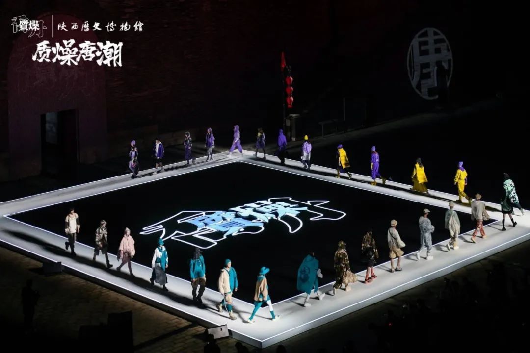 大秀进行中,伴随着“万国来潮”“唐运会”“宫宴”三大篇章联名产品的展示,相应场景的激光投影也随时映射在城墙之上,把现场观众完全置身于浓郁的唐朝潮流文化之中。以“万国来潮”部分举例: