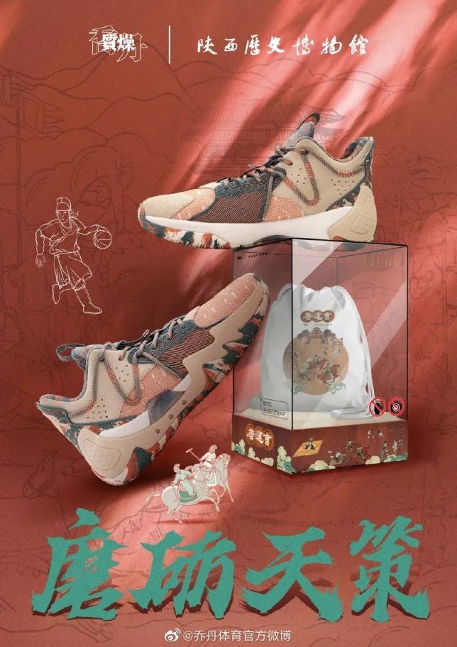 首先,乔丹质燥与传统文化根基深厚的陕西历史博物馆达成联名合作,用极富代表性的盛唐文化为产品赋能,并结合自身出色的潮流产品设计能力,打造出兼具国风与潮流色彩的“国潮”产品。