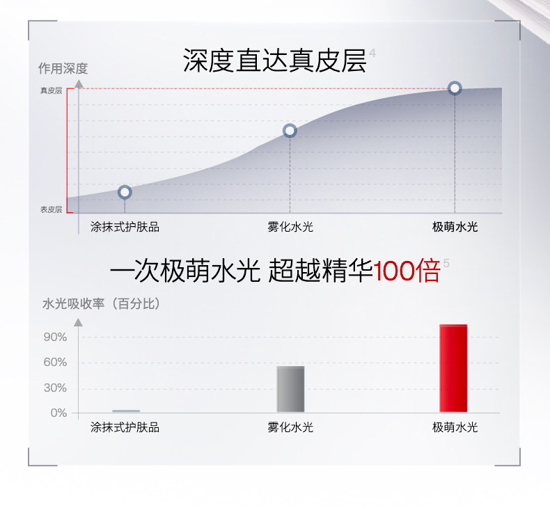 • 电脉冲超渗技术:电脉冲超渗技术提升细胞膜的穿透性,让水光精华成分深入皮肤;