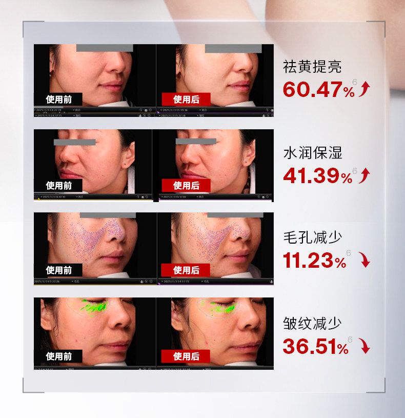 • 负压透皮技术:负压吸力瞬时紧贴肌肤,通过微晶突破角质物理屏障,打开皮肤吸收通道;