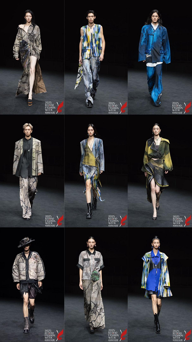 风蚀纪元:以大地色系浸染的麻感面料为载体,运用屹男独有的中式侘寂风格印花工艺,细腻复刻风蚀形成的天然肌理。岩灰、陶土与枯叶的色彩在棉麻混纺面料上层叠晕染,配合立体剪裁,塑造出如岁月雕琢的岩层轮廓,于粗粝质感中诠释沉淀、古朴与破土而出的内在力量。