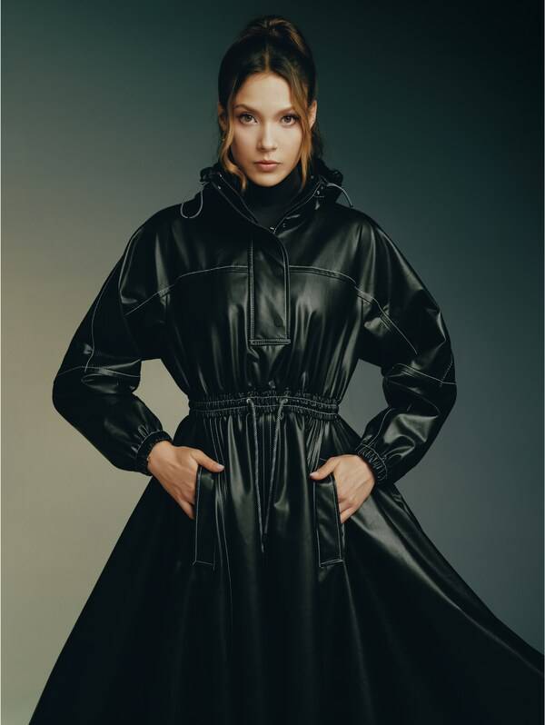 纯素皮革系列(Vegan Leather)以菌丝体皮革打造秋冬套装,品类涵盖派克大衣、运动夹克及休闲运动套装。其原料菌丝体皮革源自非食用生物资源,经特选菌株发酵生成生物基纤维,并通过循环工艺实现碳负排放,具有低碳、循环与可持续的材料优势。与此同时,纯素皮革与皮具缝线工艺的结合,充分体现时装设计与创新可持续材料的巧妙交汇。其中,女款连衣裙延续系列美学,通过腰部插袋与多色抽绳的组合,使轮廓在收放之间更显利落,呈现简约、现代且富于辨识度的时装表达。