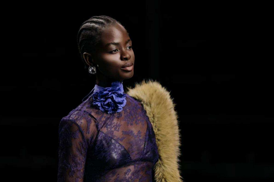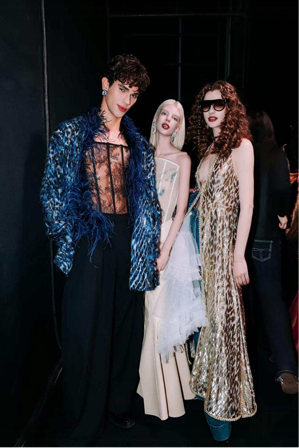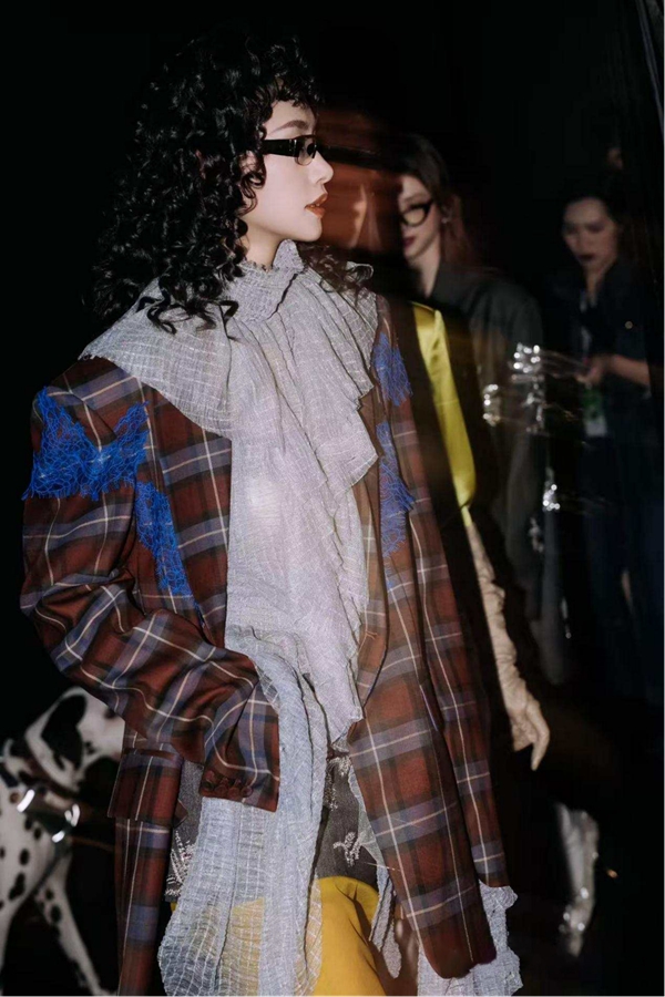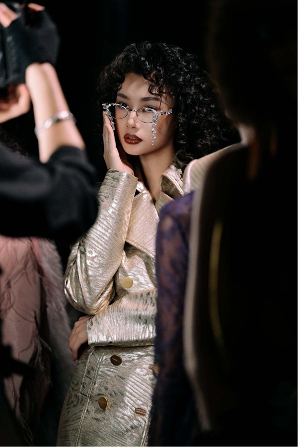 创新融合手工钉珠刺绣、立体荷叶边、灵动流苏与不对称剪裁,赋予服装层次与动感;色彩以深灰、焦糖棕为基底,用宝蓝蕾丝与金葱细节提亮质感;面料精选精纺羊毛、丝滑醋酸与金属丝混纺,在优雅与锋芒间取得平衡,致敬每一份独特、每一种自我,让每一份不被定义的存在,都成为非均质的璀璨光芒。